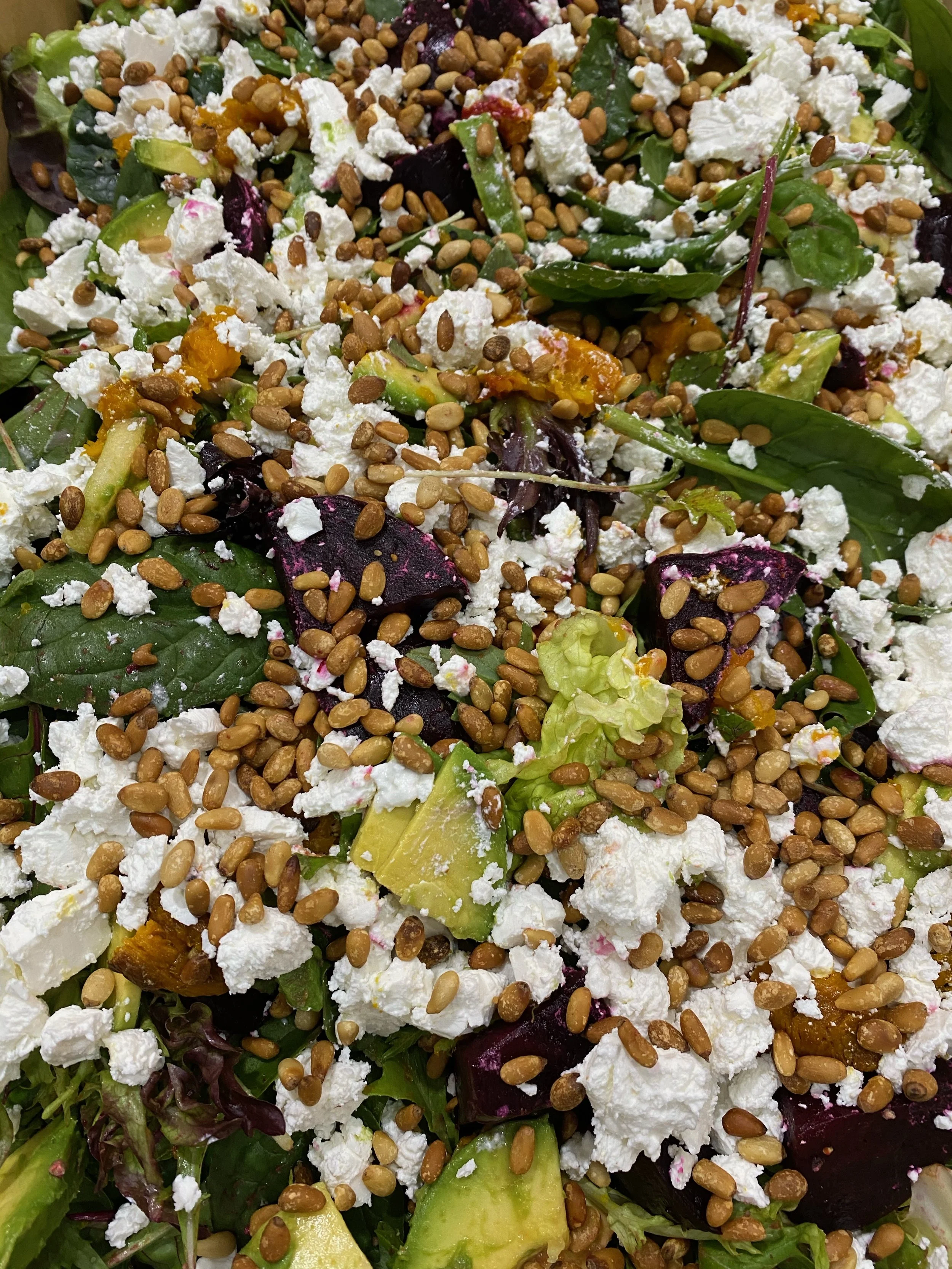 Rocket, roasted beetroot, caramelised pumpkin, feta, avocado, pine nuts balsamic vinaigrette (GF, V)